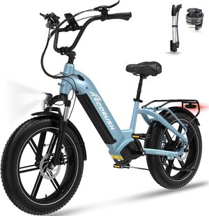 El cuadro está hecho de acero de alto carbono, sólido y algo más pesado que el aluminio, pero también más estable en descensos y con mejor absorción de vibraciones. Lleva suspensión delantera y trasera, así que puedes lanzarte por caminos pedregosos sin miedo. Los frenos de disco dobles responden bien en mojado, y las llantas de 20″x4.0″ ofrecen un agarre excelente sobre arena, nieve o grava. Es una bici todoterreno de verdad, aunque en ciudad también se mueve con soltura. Solo hay que tener en cuenta que sus casi 43 kg la hacen más difícil de levantar para meterla en un coche o subir escaleras.