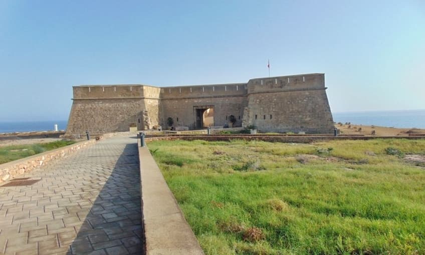Esto es historia marinera con un toque de melancolía. Guardias Viejas es, a mi juicio, el más accesible de estos pueblos bonitos cerca de Roquetas de Mar para una escapada corta. Su protagonista absoluto es el Castillo de Guardias Viejas, una mole defensiva que resiste en primera línea de playa desde el siglo XVIII. Te prometo que la luz del atardecer sobre su piedra antigua es, sin exagerar, una de las mejores excursiones desde Roquetas de Mar que puedes hacer.